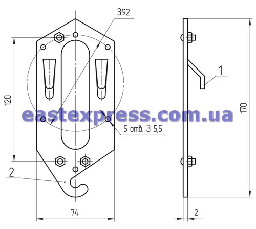 Подвес снабжен двумя лапками 1 для подвешивания и закрепления (путем отгибания к телу подвеса) на тросе и имеет зажим заземления. В зависимости от узла крепления светильник подвешивается на крюк 2 подвеса, либо с помощью держателя У25М или патрубка УСЭК82.